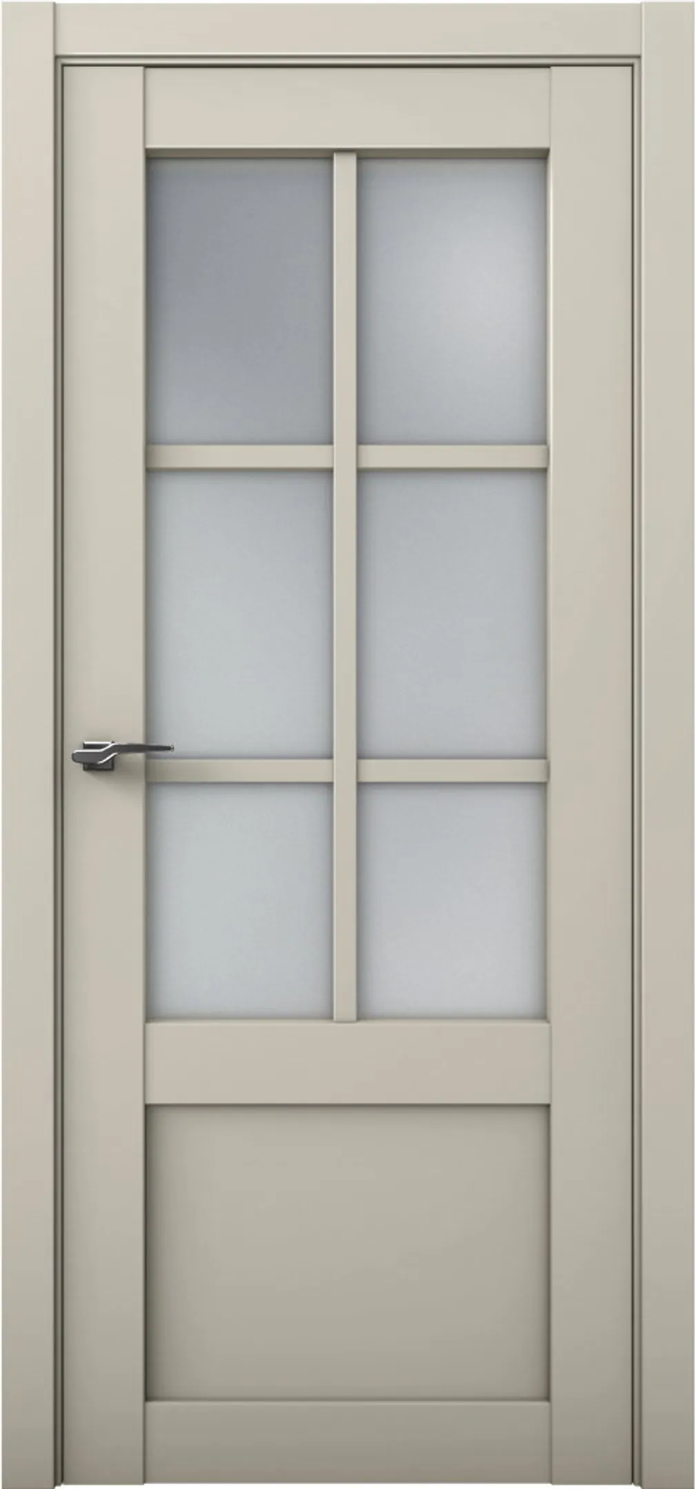 Дверь Манхэттен-1 ДО имеет каркасно-щитовую конструкцию с фрезерованной поверхностью полотна, имитирующей филенки. Модель остеклена светлым или темным сатинатом на выбор и покрыта эмалью.